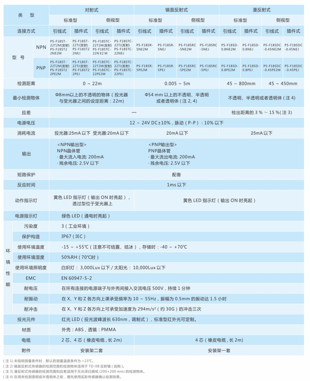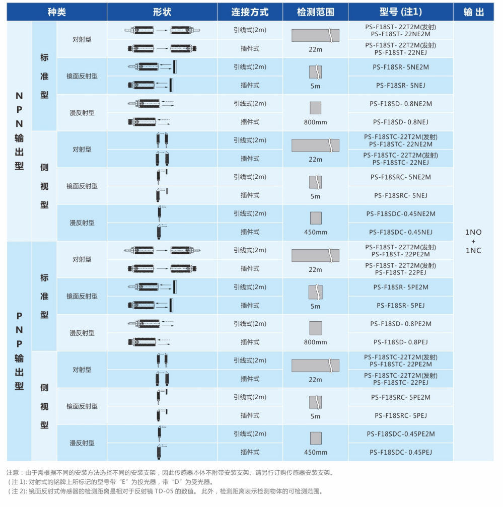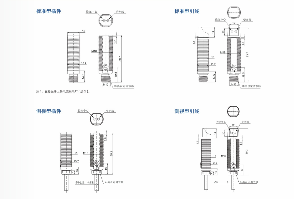 产品种类齐全(类型:标准型、侧视型;连接器:2m 电缆长度型M12 连接器)。