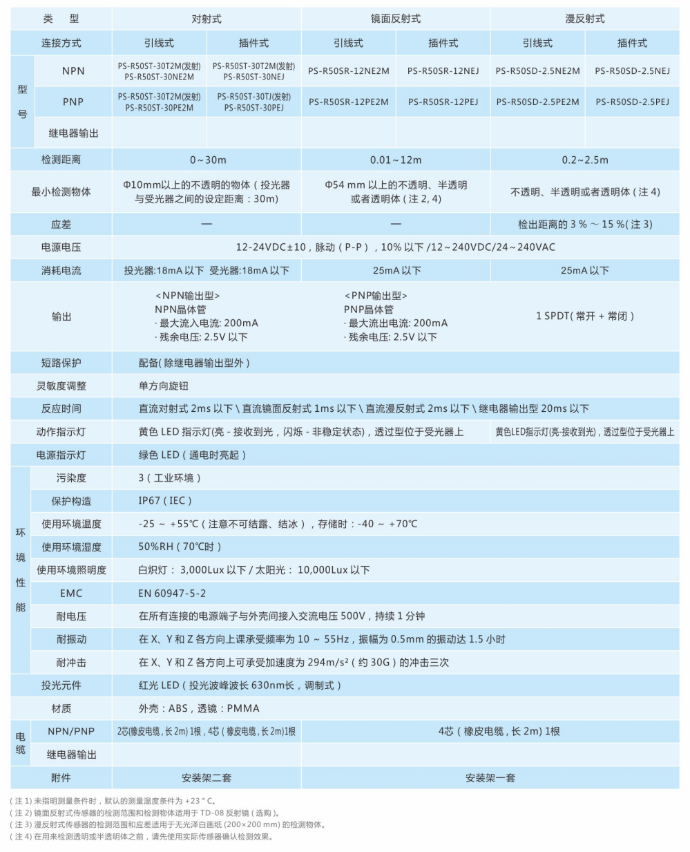 漫反射:2.5m; 镜面反射:12m; 对射:30m。